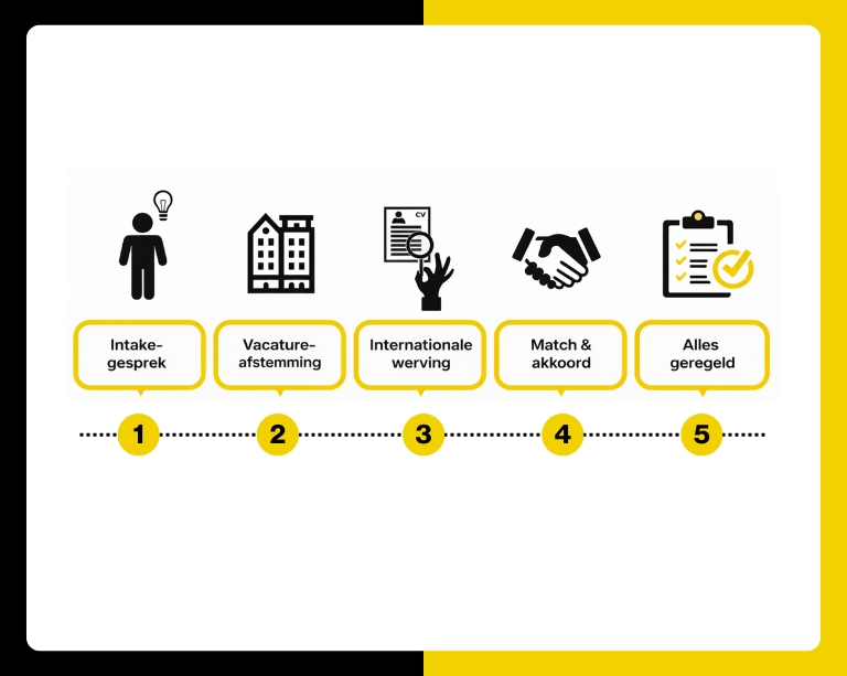 Vanaf daar nemen wij het volledig over. We regelen alles rondom aankomst, planning, huisvesting, ziektekostenverzekering en bankzaken. Dit hele proces is strak georganiseerd en vindt doorgaans plaats binnen één werkweek.